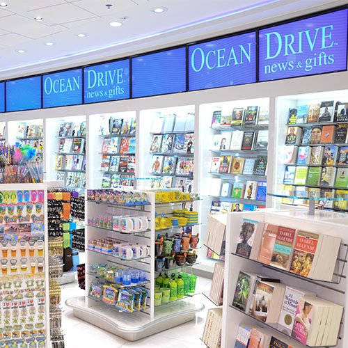 We operate 24 concessions in Terminals D, E, G &H in both Pre and Post Security. Consisting of our proprietary brands NewsLink® newsstand our award winning AirEssentials® branded convenience concept. Home of our one-of-a-kind, The Shoppes at Ocean Drive. An upscale department store setting showcasing national brand partners such as Puma®, and Lacoste® in Zone 305 sportswear. It doesn’t stop there, we also feature BookLink® & Cafe along with, Coco Bay Apparel & Accessories, Victoria’s Secret® and Unique Gift concept Britto®.